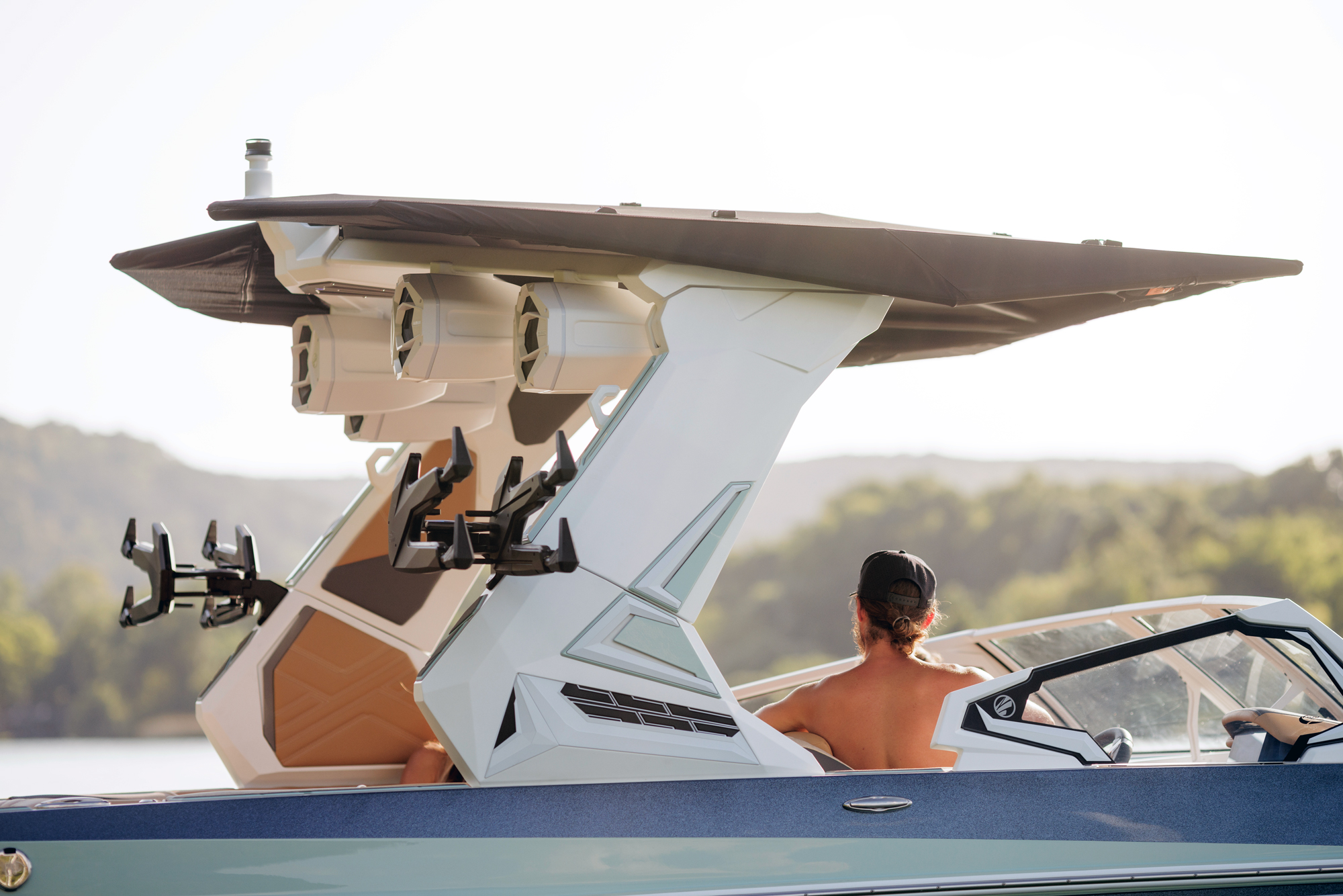 New for 2026 on the Ultré ZX Class is the Ultré Powered Tower. The tower's advanced engineering and patented four actuators deliver uncompromising strength for towing watersports at any height—fully raised, lowered, or anywhere in between—while maintaining abundant head clearance throughout the boat. Industry-first features include built-in board bags, life jacket hangers, enhanced lighting accents, and multiple tow points. The bimini can be optioned with Tigé's SheerShade canvas, which filters soft sunlight while providing 85% shade. For more coverage, optional Cove Covers attach to the Ultré Tower—choose the version that shades the transom or the Elite model that covers from bow to transom.